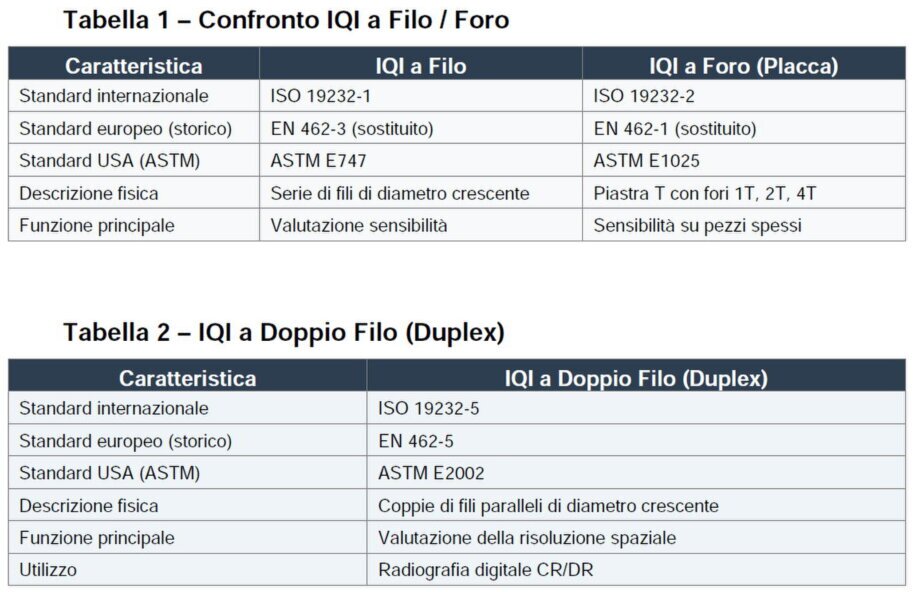 Consentono di determinare sensibilità, passo risolvibile, qualità geometrica e requisiti minimi, in base a materiale, spessore, classe di qualità, tipo di IQI (fili o fori) e configurazione radiografica.