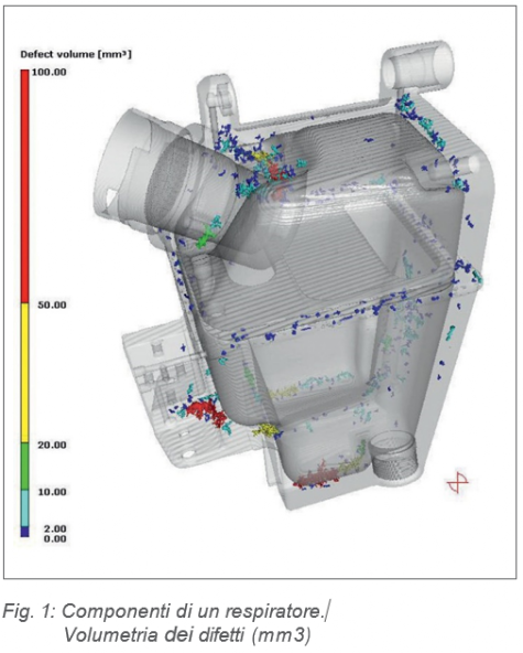 L´applicazione in esame riguarda un componente essenziale di un respiratore di rianimazione. Il componente è costituito da due elementi fusi, saldati su due lati di una lastra. La TC permette di individuare tipici difetti di fusione e saldatura, comprese le porosità nei due elementi fusi. Le informazioni ricavate permettono al produttore di ottimizzare i processi produttivi, minimizzando le porosità nei cordoni di saldatura.